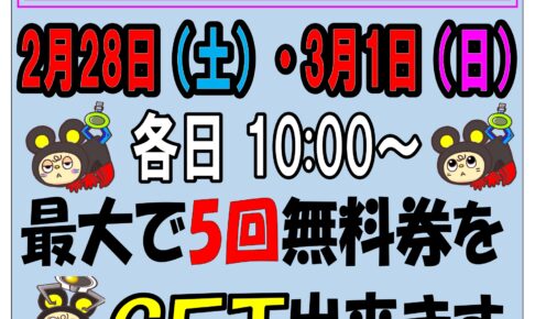 イベント今週末、そして2月最後、3月最初のイベントは、みんな大好き&大好評の「無料券くじ引き」を開催致します‼️ 誰でも無料で参加でき、最大で5回無料券がGET出来ます🤭 ただし、くじが無くなり次第、終了となりますのでお…
