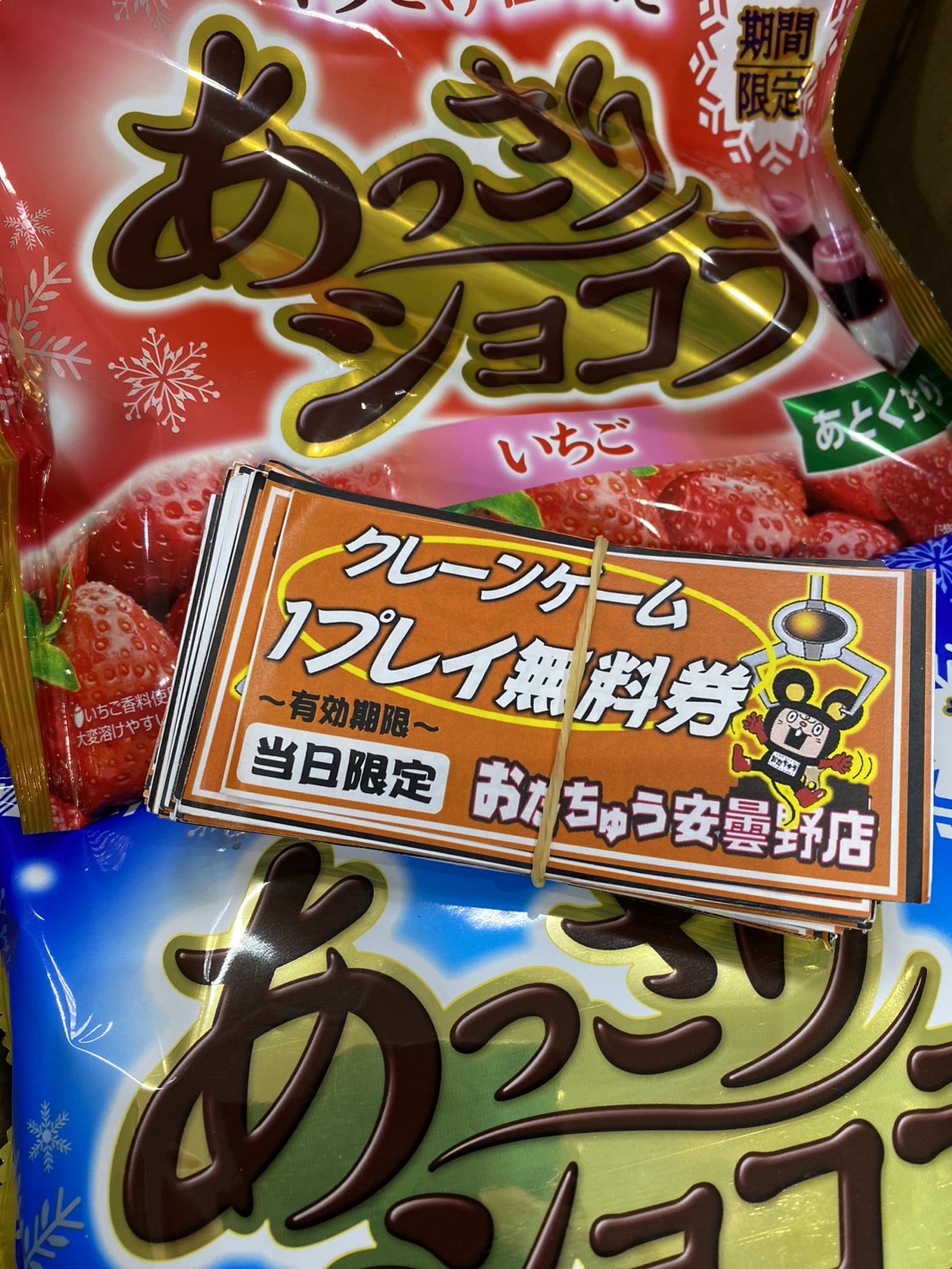 跳ねたり転がったりするヌイグルミを当たりの枠内で止められたらチョコレートなんと1袋まるっとプレゼント!