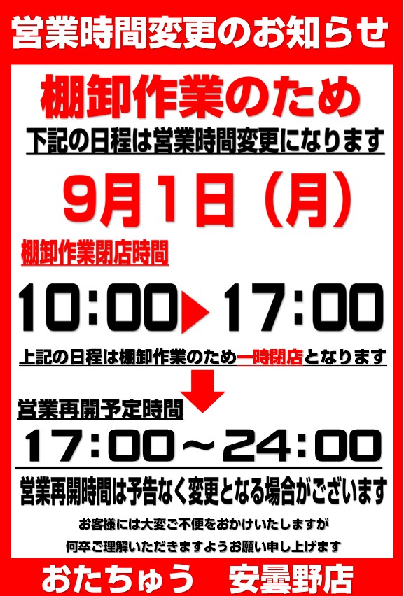 【重要】9/1 営業時間に関するお知らせ■ 2025年8月20日 2025年9月1日 ★おたちゅう安曇野店より営業時間に関するお知らせ★ 以下の日程は棚卸作業のため営業時間が変更となります。 お客様にはご不便をおかけしますが 何卒ご理解いただきますようお願い申し上げます。