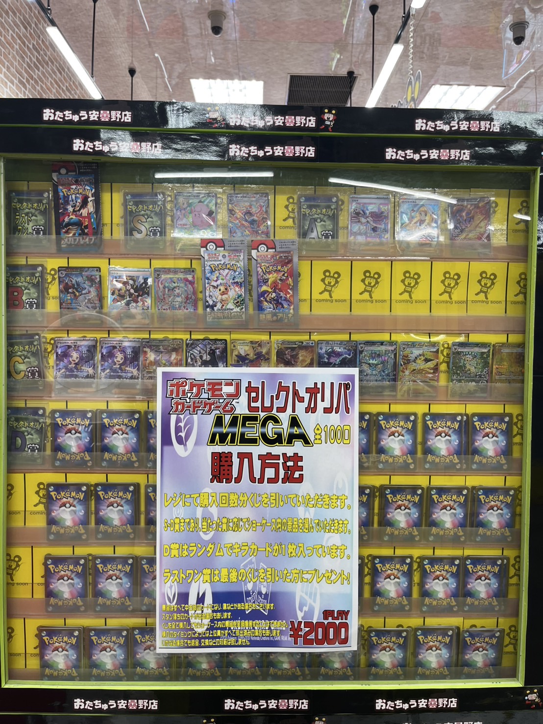 ★ポケカのセレクトオリパMEGAが稼働!★ 2025年9月2日 カードショーケースにて、ポケカセレクトオリパMEGAを新たに稼働させました!!! 1回2000円でレジにてくじを引いてもらい、出た賞に応じてショーケース内のカードを選んでいただきます! 500円のセレクトオリパとは違い、こちらはラストワン賞もあります! 500円の方も引き続き稼働してますので、こちらも併せて是非この機会にチャレンジしてみてください!
