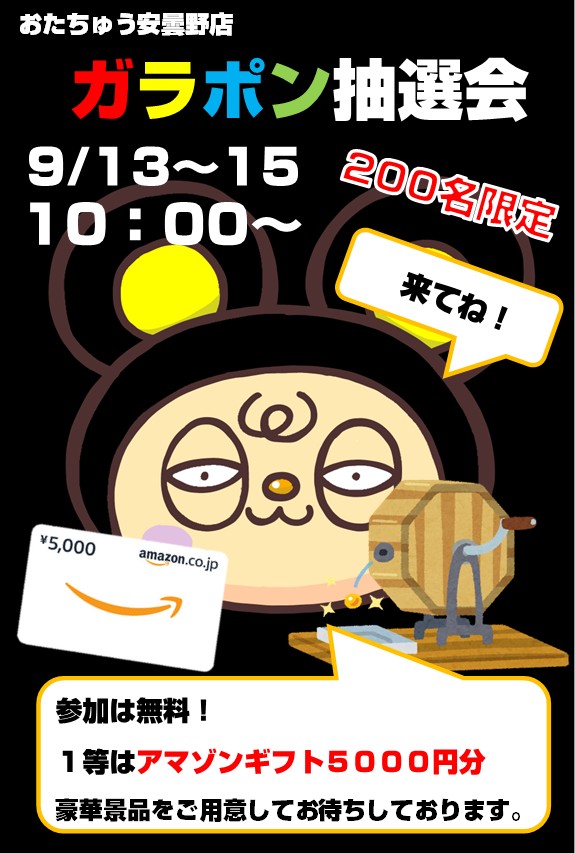 13日~15日はガラポン抽選会! 2025年9月10日 2025年9月16日 9月3連休、おたちゅう安曇野店は今週もイベントやってます! 今回は「ガラポン抽選会」! 今回の一等は【Amazonギフトカード5000円分】をご用意!! 他にも景品盛りだくさん! 参加無料、限定200名様限定のガラポンとなりますのでどちら様も是非この三連休は遊びに来て下さいねー! ************************ こちら↓もぜひチェックしてみてくださいね♪(*´▽`*) ・最新のイベント情報はこちら ・最新の買取情報はこちら