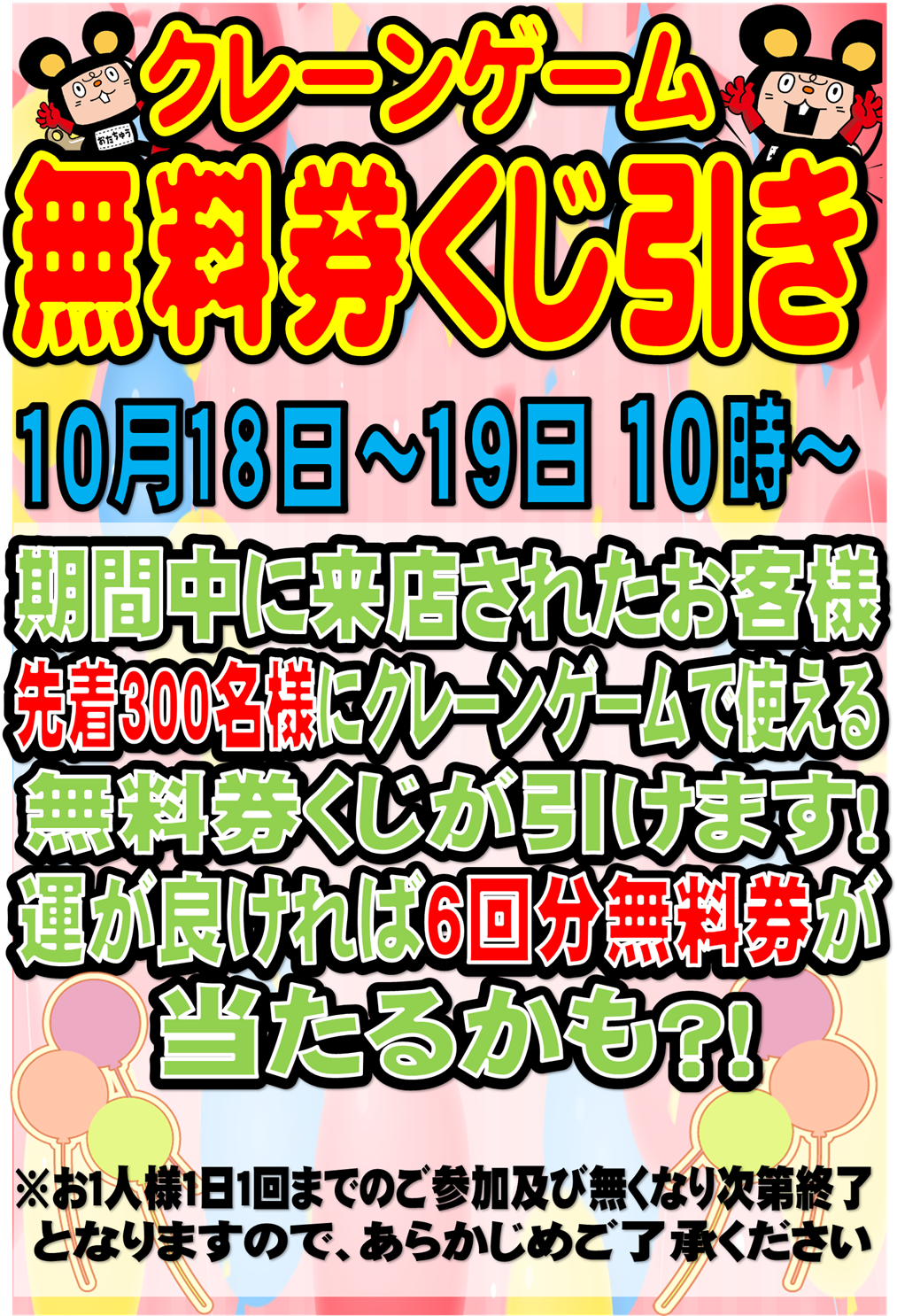 【クレーンゲーム無料券くじ引き】イベントを開催します!!