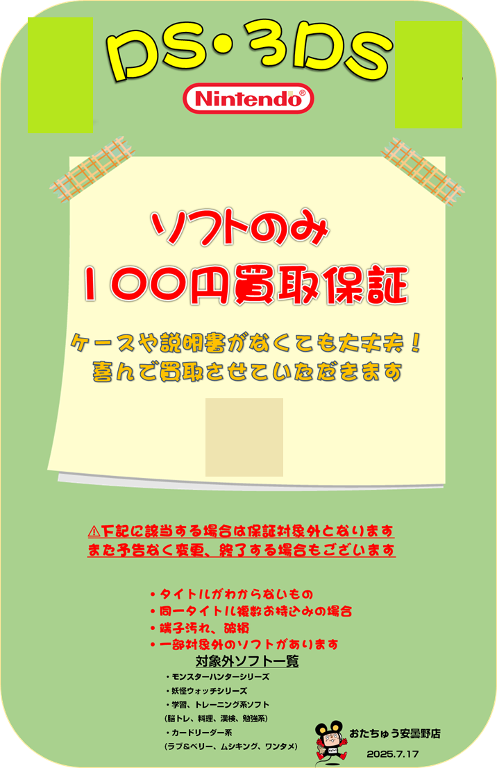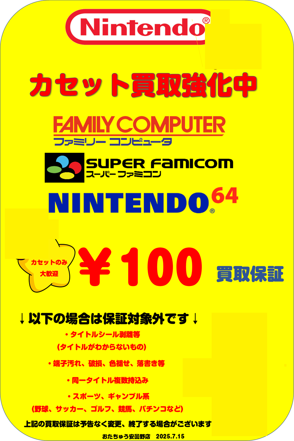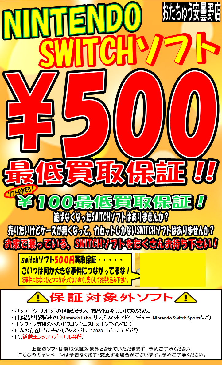 おたちゅう安曇野店では、各種ゲームソフト、ゲーム機本体、周辺機器を、絶賛買取保証中!