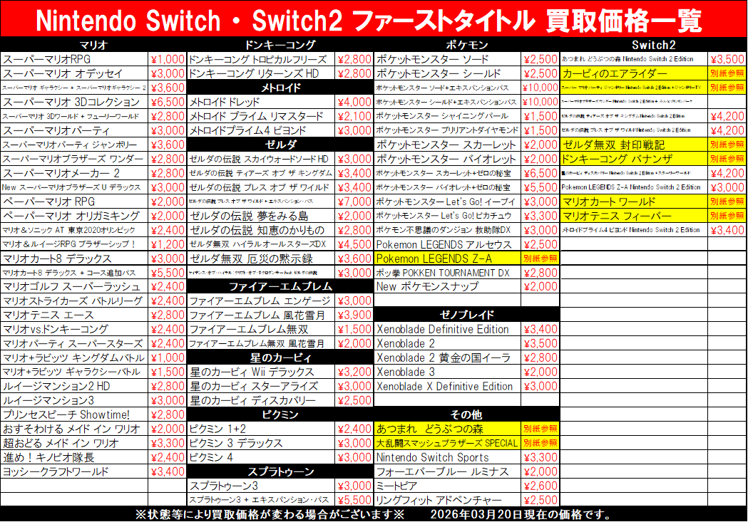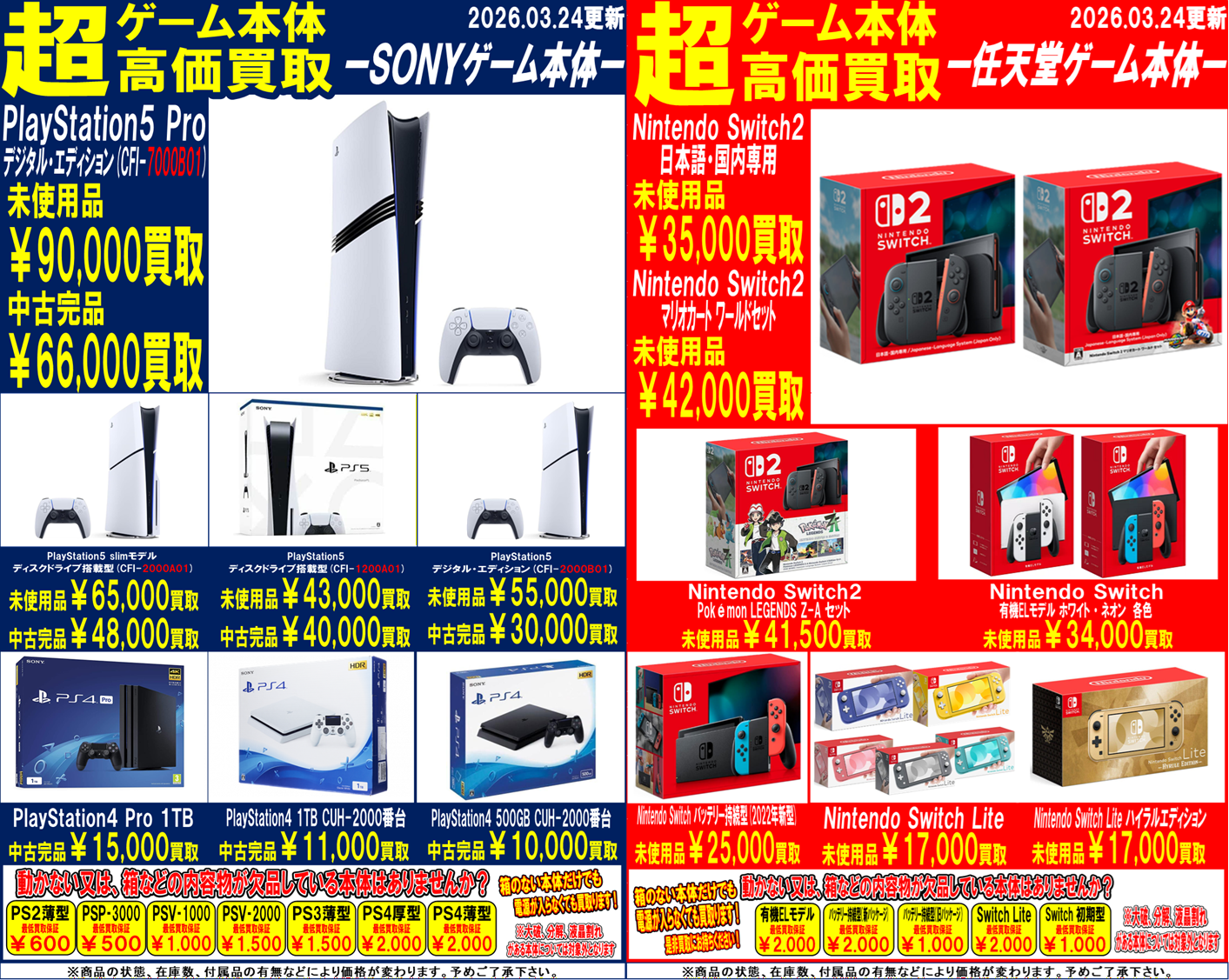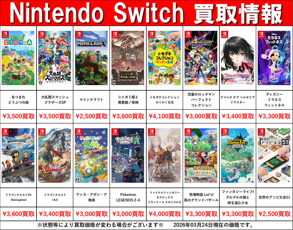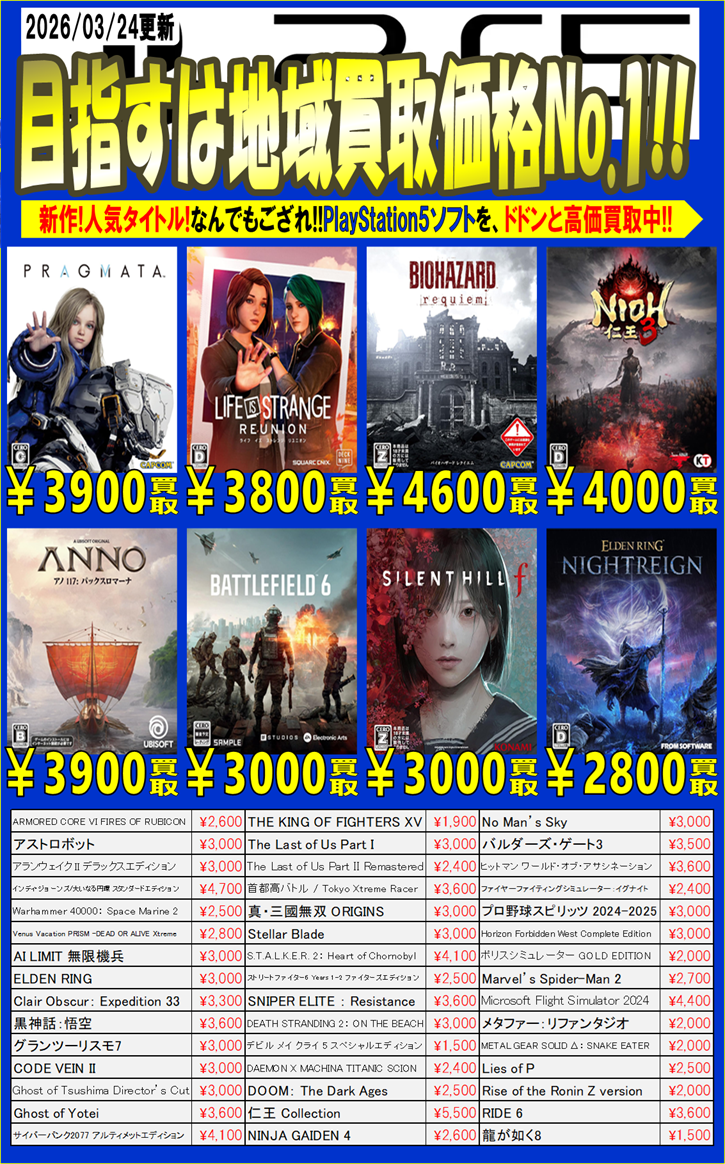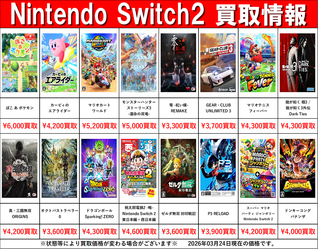 【Switch・Switch2】03月24日:ゲーム部門買取告知【PS5】