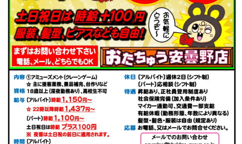おたちゅう安曇野店では、私達と一緒に働いてくれるスタッフを大〜募集しております‼️ ・アルバイト(フルタイム) ・パート どちらでもOK👍 クレーンゲームに興味がある方、自分の個性を活かして働きたい方etc… 気になった…