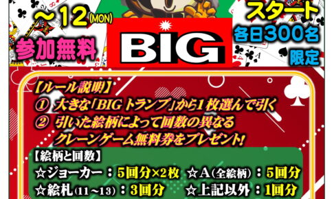イベント今週末、1月10日(土)から12日(月祝)の3連休は、成人の日特別企画と題しまして 『トランプくじBIG』🃏を開催します❗️ こちらのイベントは、以前行った『トランプくじ』をバージョンアップした新たなイベントでございます…